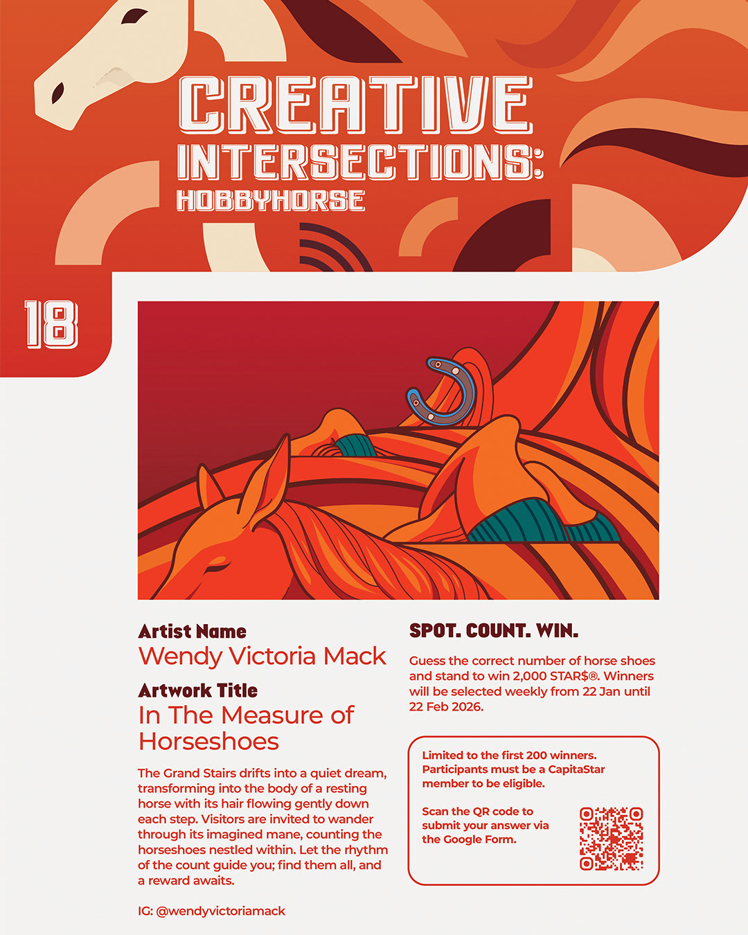In The Measure of Horseshoes is a site-specific environmental artwork created for Funan’s Grand Stairs as part of Creative Intersections: Hobbyhorse, Rhythm and Forms of Play, a mall-wide activation presented during Singapore Art Week 2026.